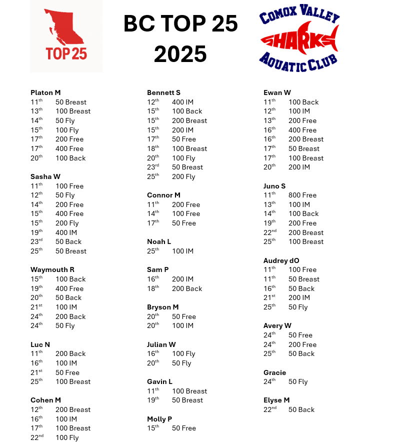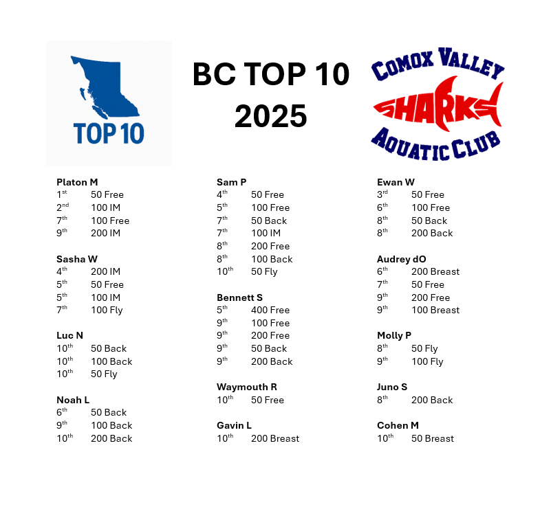 Shark BC Top 10 and BC Top 25 ranked swimmers